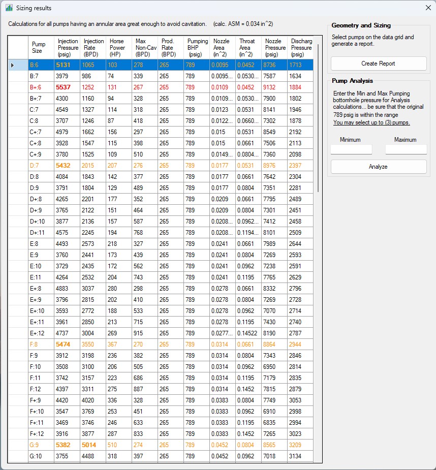 Once input data is set, the Jet Pump software/app calculates all pump sizes that meet the minimum criteria for operation at a given production rate.